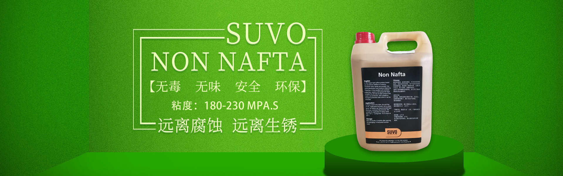 SUVO Non Nafta 是一款無毒、無味、安全、環(huán)保的油基/蠟基防銹產(chǎn)品,不含溶劑,內(nèi)含超強(qiáng)的防腐劑。 涂刷本產(chǎn)品后,會在被保護(hù)的工件表面形成一層80-100微米厚的油脂、蠟基保護(hù)膜,保護(hù)金屬產(chǎn)品免受惡劣環(huán)境侵害,遠(yuǎn)離腐蝕,遠(yuǎn)離生銹。 產(chǎn)品適合于鋼鐵制品在陸地存儲或海上運(yùn)輸過程中的長期防腐,防銹。本產(chǎn)品非常易于被石油精/煤油清洗劑清除,清洗過程不損傷工件表面,不污染施工環(huán)境。